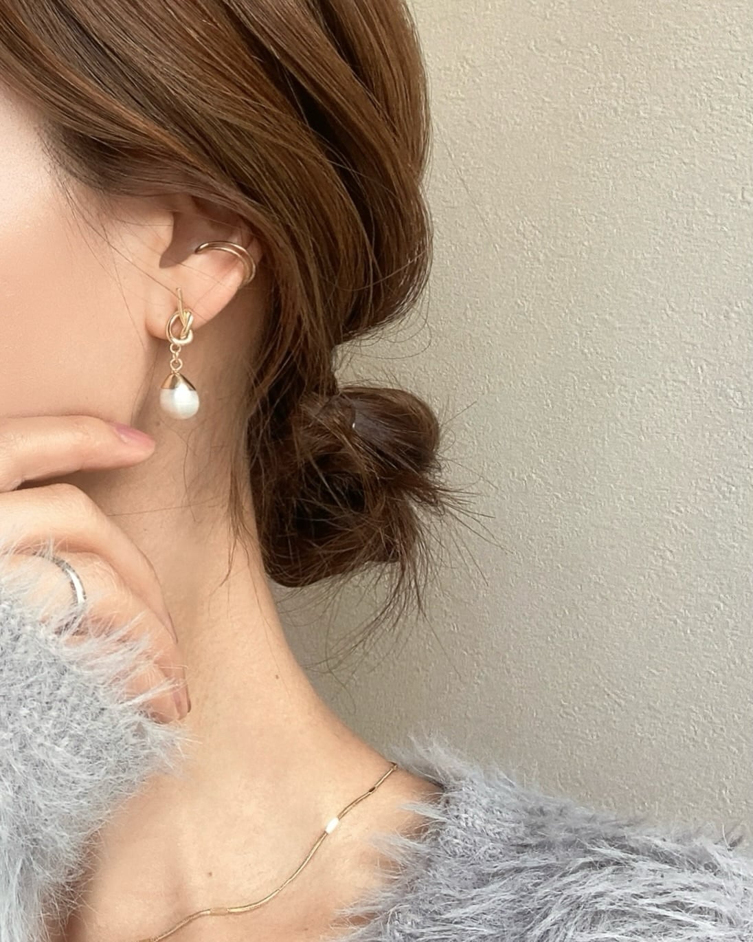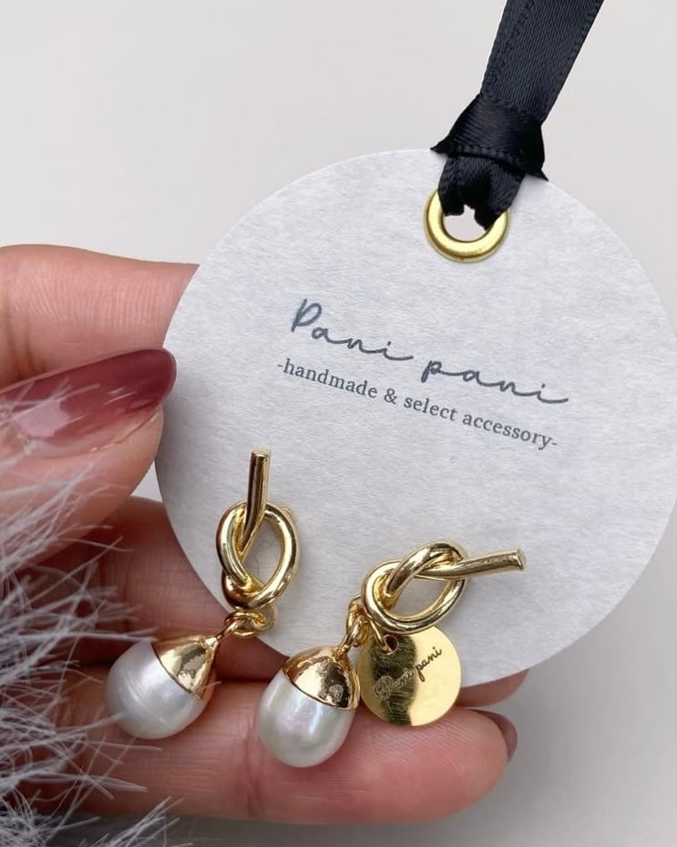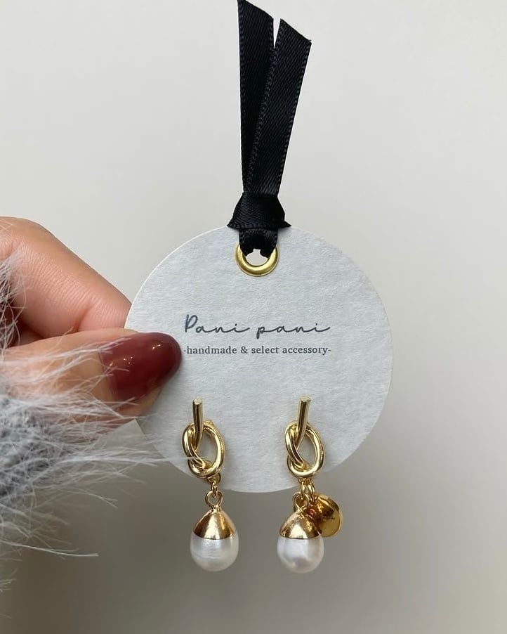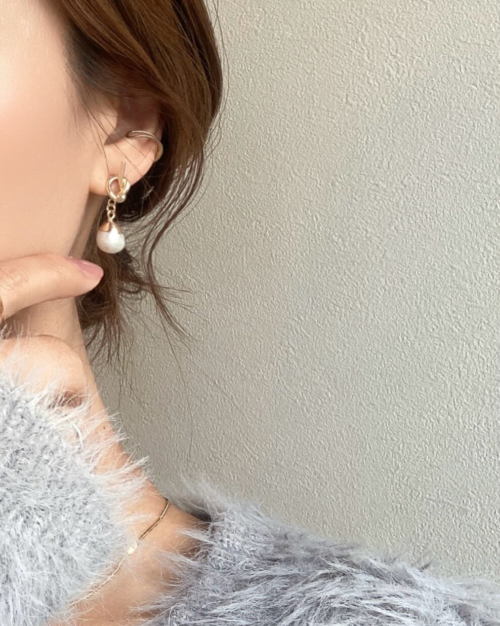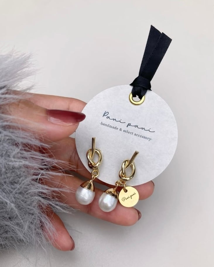シンプルな中にも一癖ある結びデザインのピアスと合わせました☺︎