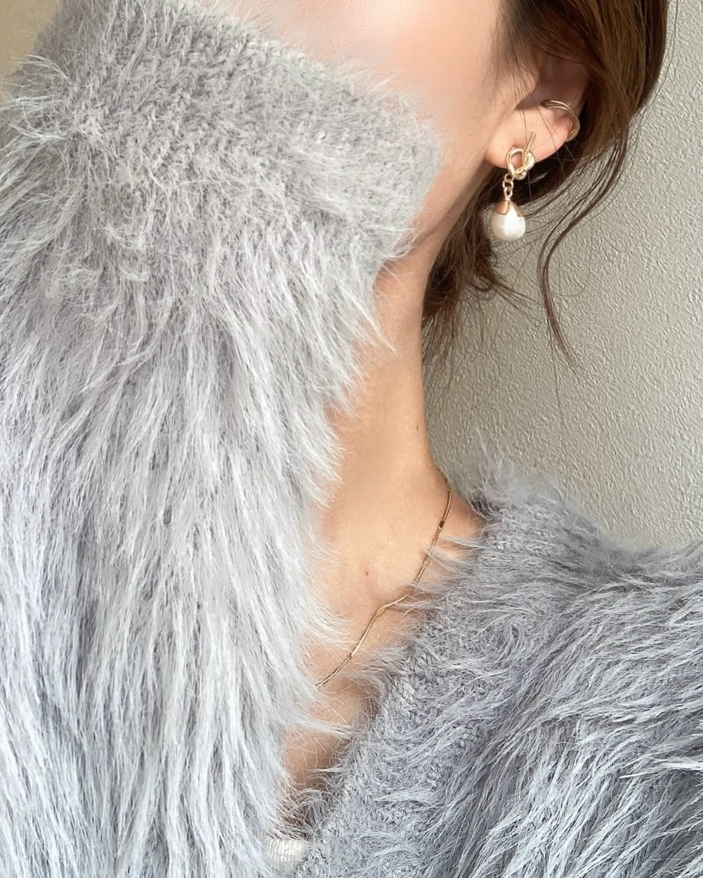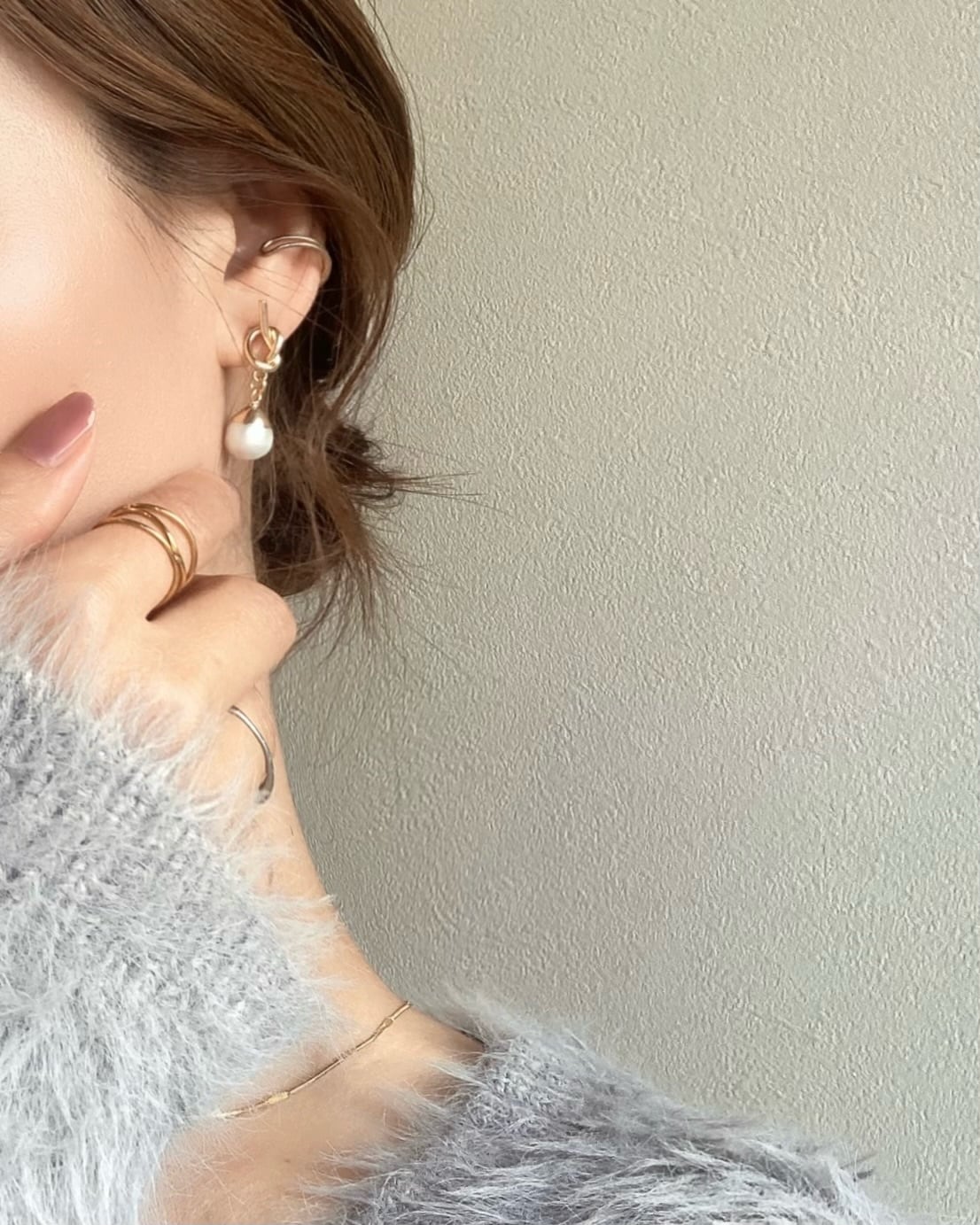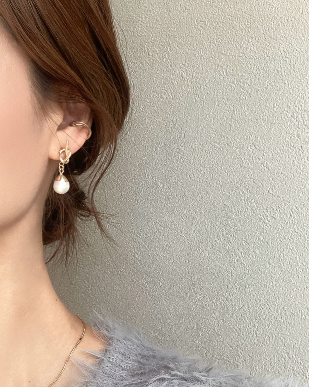 シンプルな中にも一癖ある結びデザインのピアスと合わせました☺︎